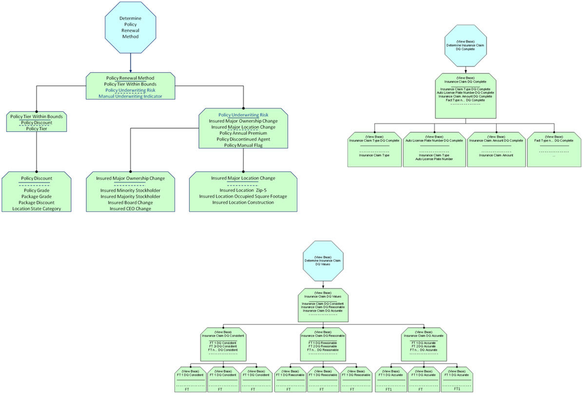 The similarities among Decision Models are evident in its two visual representations. The first is the decision model diagram. The decision model diagram reveals the structure of Rule Families and inferential relationships among them. Figure 1 contains three decision model diagrams.
