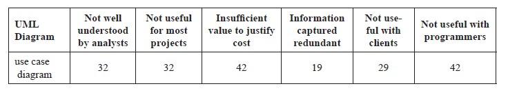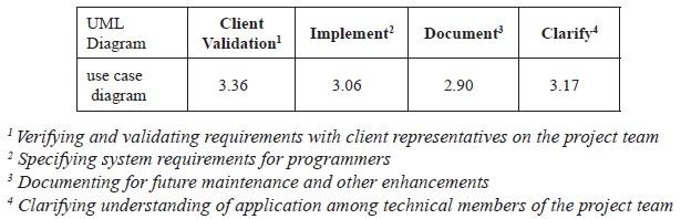 As would be expected, Client Validation has the highest score. However, it seems that the 2.90 score for Document for future maintenance and other enhancements is low. It appears that practitioners are not taking into account that enhancements, in particular, are not always performed by the personnel that originally created the system. Use Case diagrams are extremely useful in providing personnel, not familiar with the original system, a business context to understand. This may be a consequence of the diagram not being well understood by analysts.