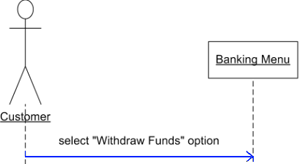 Notice how the object lifelines are now represented as object class types (e.g. “: BankingMenu”) or as named object instances with their class types (e.g. “customerAccount : BankAccount”). Notice how, in many cases, the informal messages have been replaced with prospective object responsibilities or operations such as the operation “debit(amount:Long)” that is invoked on the BankAccount object.