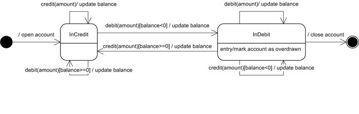 When the debit operation event is invoked on a BankAccount that is in the InCredit state, the account either transitions to the InDebit state (if the condition [balance<0] is true) or it stays in the InCredit state (if the condition [balance>=0] is true). Either way, the balance must be updated by performing the update balance action.