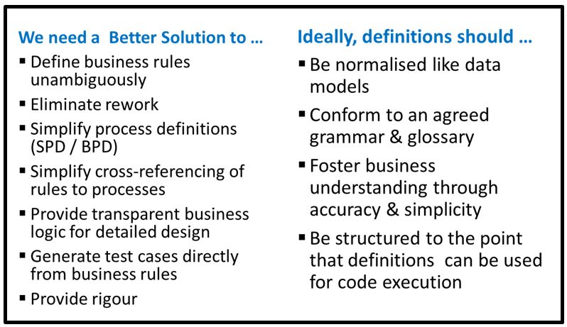 But – and it was a big but – there was one area where our efforts were not, in all honesty, really successful. This was the area of business rules. Experienced readers will likely concur that the area of business rules has historically been somewhat unsuccessful. Here are the kinds of problems which we encountered and which most readers have probably also encountered: