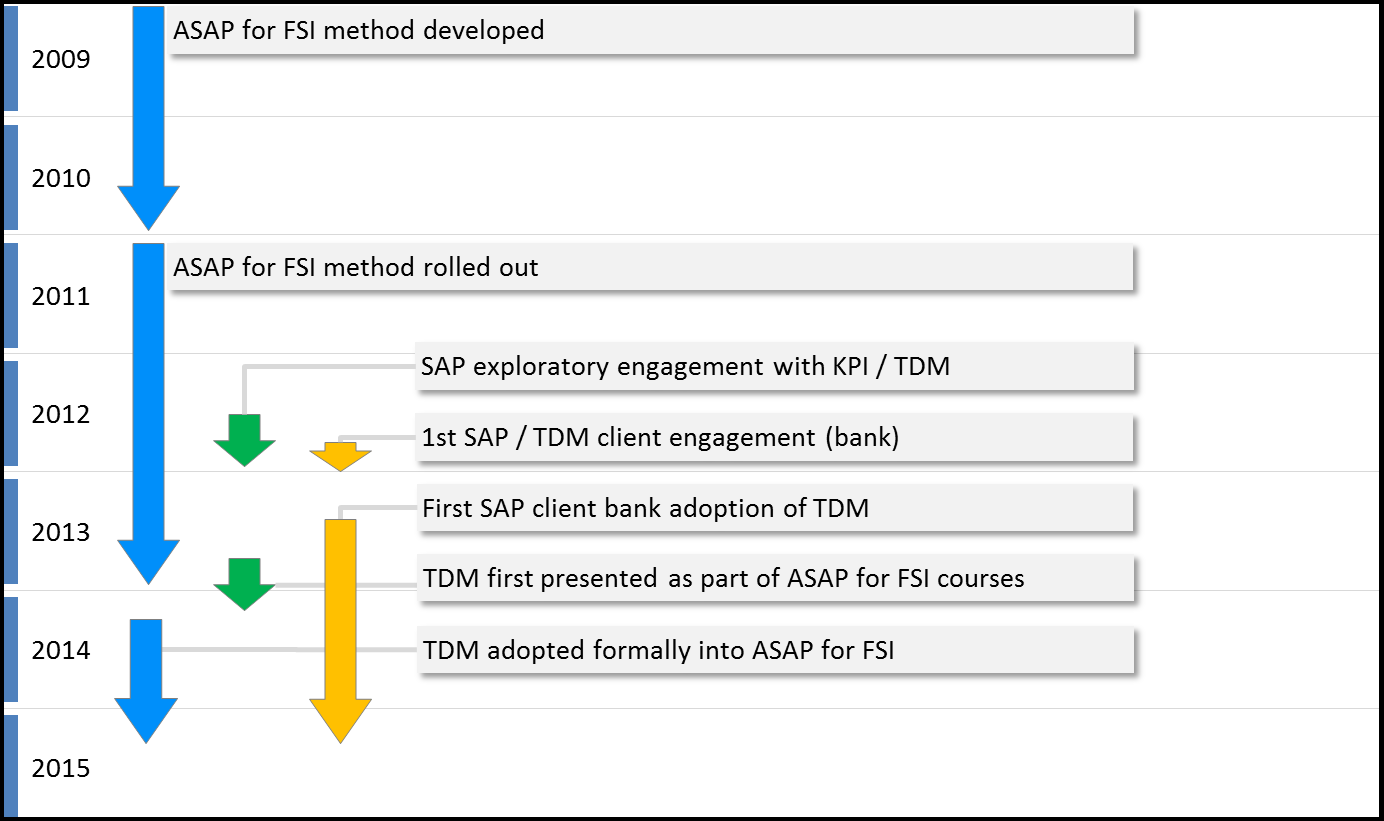 From here on in, the idea started to take off, both within SAP and outside it. Within SAP, it was agreed, based on the successful transition to production of TDM on a live project that it should be incorporated into the existing ASAP for FSI method; so we moved on to training and disseminating the approach more widely within SAP for FSI.