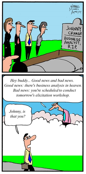 Johnny, the Business Analyst: "Hey buddy...  Good news and bad news.  Good news: there's business analysis in heaven.  Bad news: you're scheduled to conduct tomorrow's elicitation workshop."