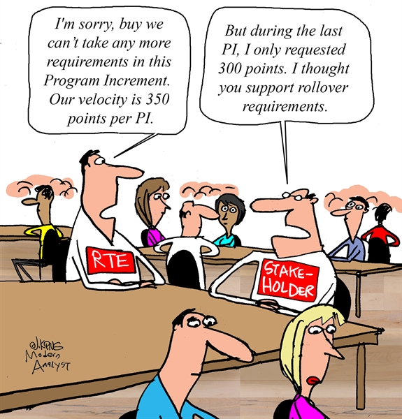 Release Train Engineer: "I'm sorry but we can't take any more requirements in this program increment. Our velocity is 350 points per PI."